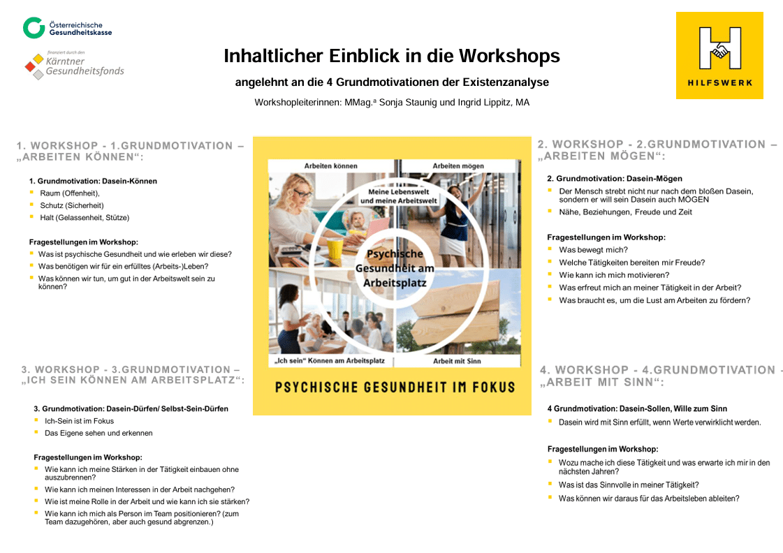 Die Workshops basieren auf der Existenzanalyse und den vier Grundmotivationen nach Alfried Längle, die Themen wie Halt, Sicherheit, Beziehungen, Lebensfreude, Sinnorientierung und Persönlichkeitsentfaltung in den Mittelpunkt stellen. Dabei werden praxisnahe Fragen behandelt: