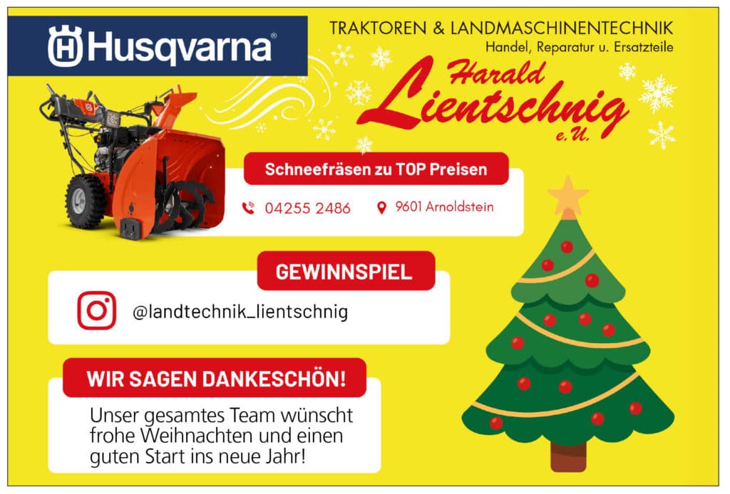 Erstmals veranstaltet die Firma Lientschnig ein Gewinnspiel auf Facebook und Instagram. An jedem der vier Adventssonntage wird ein attraktiver Preis verlost. „Mit unserem Gewinnspiel möchten wir allen Kundinnen und Kunden Danke sagen und ihnen in der Vorweihnachtszeit etwas zurückgeben“, erklärt Harald Lientschnig. Die Teilnahme ist unkompliziert und wer mitmacht, kann sich über tolle Preise freuen.